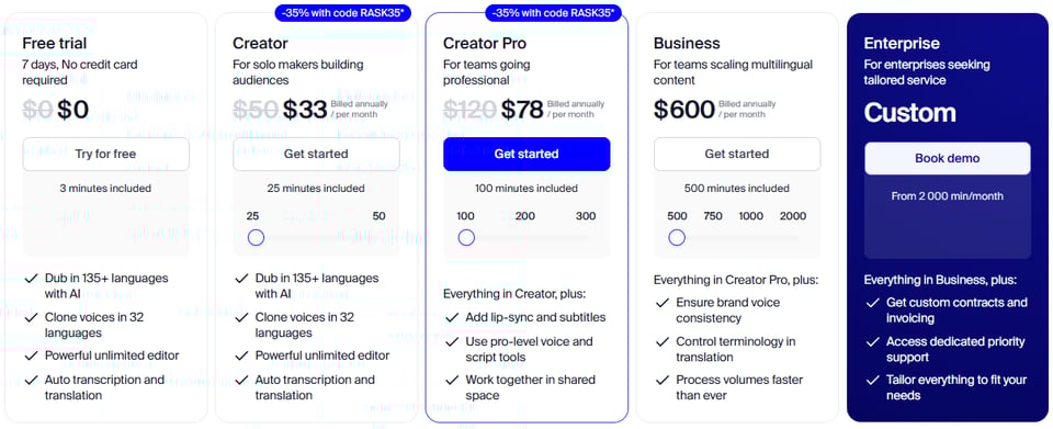 Rask AI hat ein neues Preismodell eingeführt, bei dem Sie Ihren Plan innerhalb unseres bestehenden Plans individuell anpassen können. Im Creator Pro- und Business-Modell können Sie den Schieberegler bewegen, um Ihren individuellen Plan entsprechend Ihren Anforderungen und Ihrem Budget zusammenzustellen.